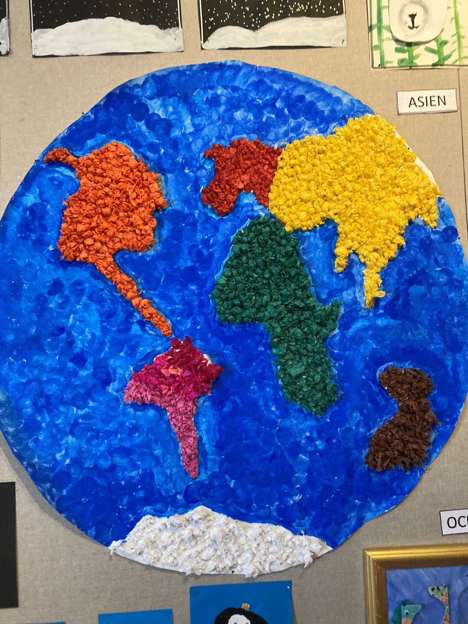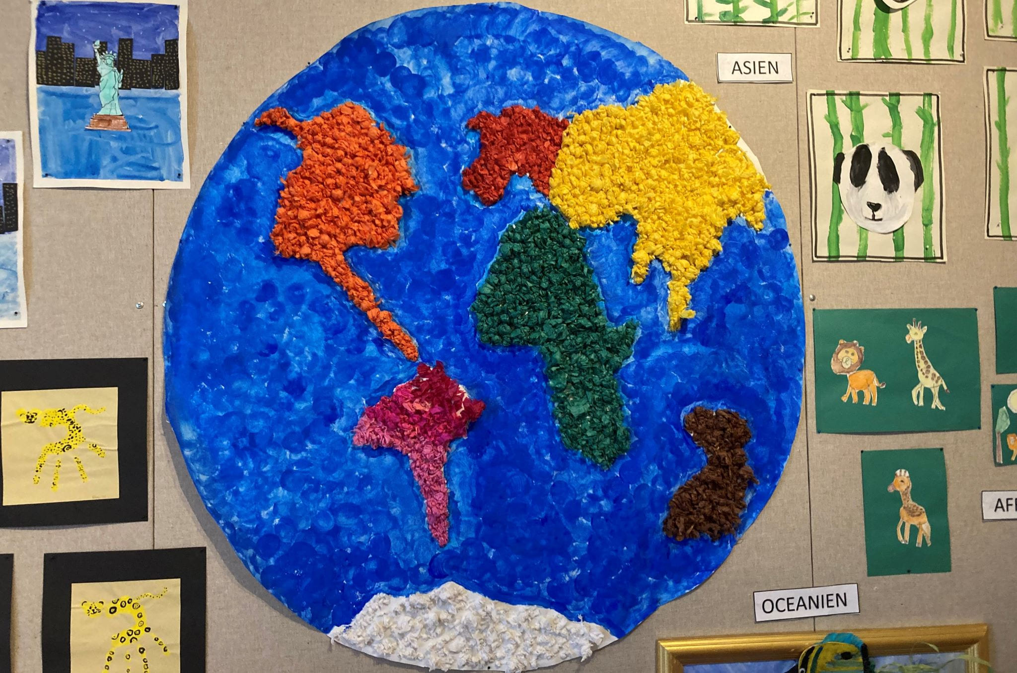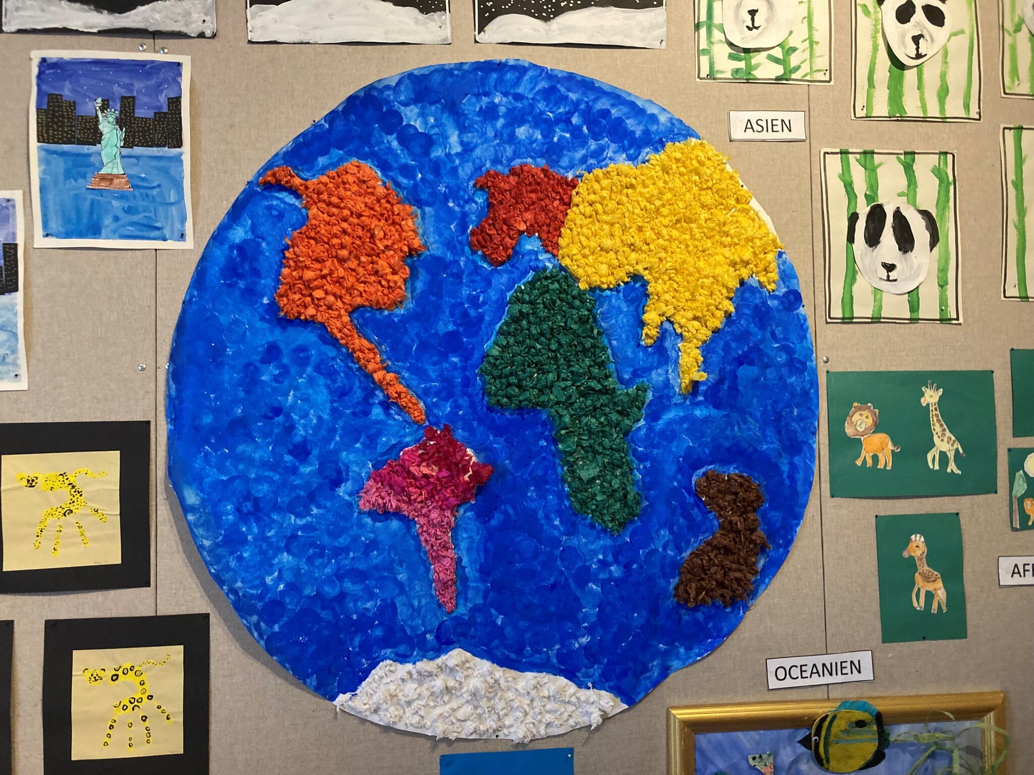 Under vårterminen har Förskoleklassen i sina tre grupper arbetat med ”Jordens utveckling” och jorden med alla världsdelar. Mycket fokus har varit på djuren både från dinosaurier till djur som finns både i våra vatten och på land. Barnen har arbetat i många olika tekniker och gjort fantastiska bilder och skulpturer allt ifrån ”the Big bang” till lavautbrott och djur från alla världsdelarna. Veckan innan påsklovet har vernissagerna avlöst varandra och nu kan vi alla ta del av barnens fina skapelser på Torget.