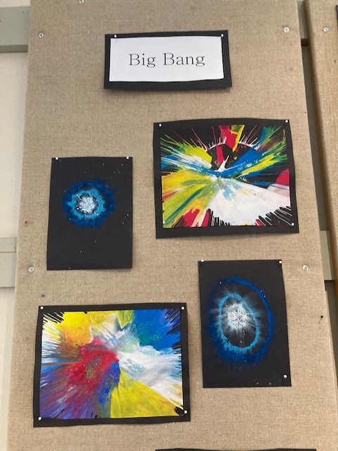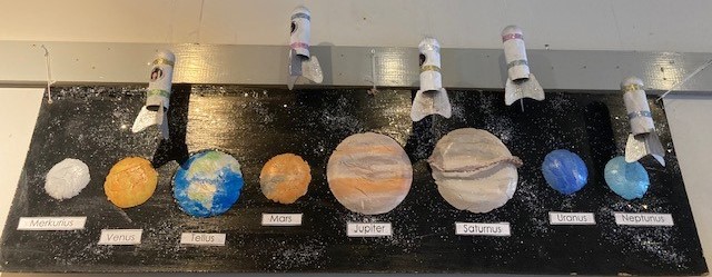 Än en gång har förskoleklassen med sina tre grupper ställt ut på ”Torget” med en mångfald av olika tekniker och uttryck och visar upp fina bilder och skulpturer. Det som är gemensamt är att det handlar om utvecklingen från ”The Big Bang” och jordens utveckling till djur från dåtid till nutid. Barnen tycker att de lärt sig mycket – det känns som om man rest på riktigt! Barnen har berättat om att ”Jorden” rör sig hela tiden fast man inte känner det och har en måne. Längst upp i Sverige kan det vara ljust både på dagen och natten. Vi visste inte att det fanns så mycket olika djur i världen! Fåglarna utvecklades från dinosaurier och människan härstammar från apor.
